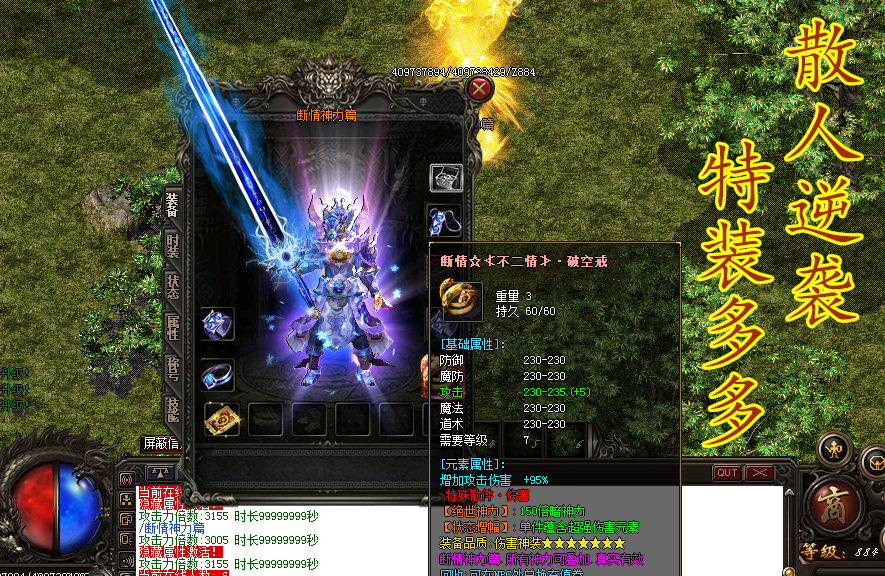 - 【充值比例】:1RMB=10W元宝+250断情币+3游戏点.网银多送100%.多充多送.散人打RMB卷一样可拿满回馈!