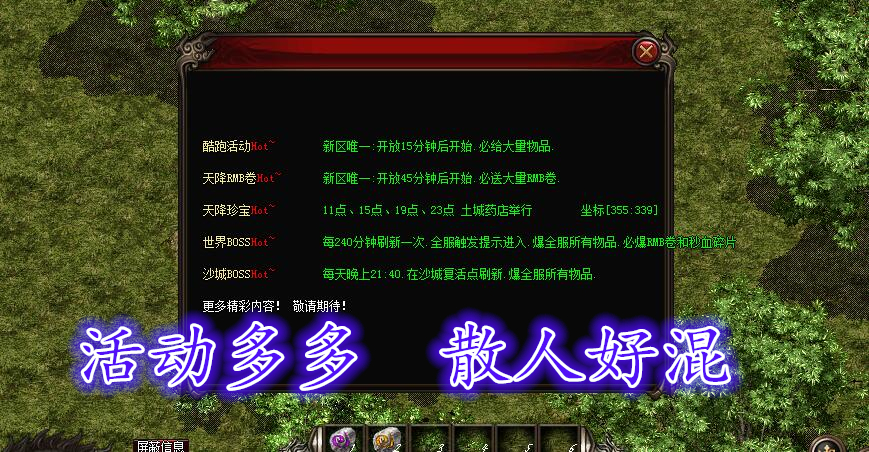 - 【活动介绍】:开区15分钟.45分钟均有新区唯一活动.送大量RMB卷和起步装备.散人一定要参加!