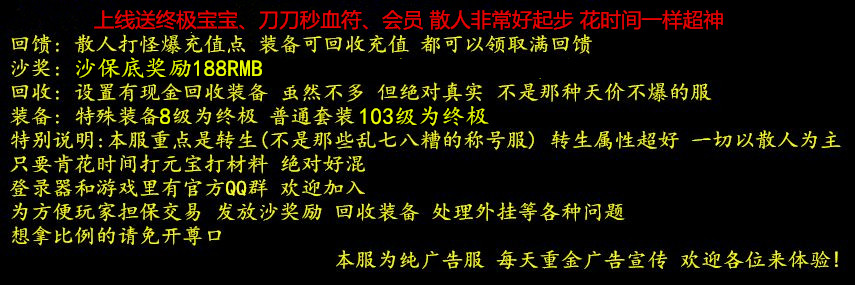 - 【游戏介绍】:上线送刀刀秒血+终极宝宝+会员.上线就去各大城市狂搞BOSS.真正散人BOSS服!!!!!