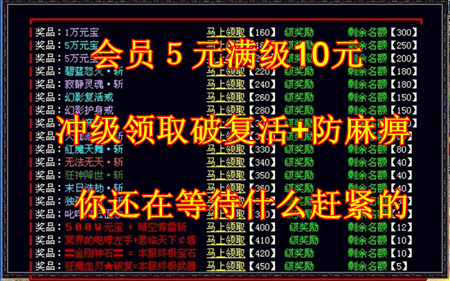 【游戏介绍】:一切免费到底,冲级奖励丰富 回收超高 等级好挂 终极狂暴。