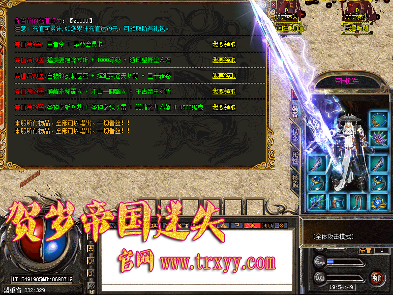 - 【游戏介绍】本服小资消费,终极礼包只需几十元,只赚广告费,打造人气大服!