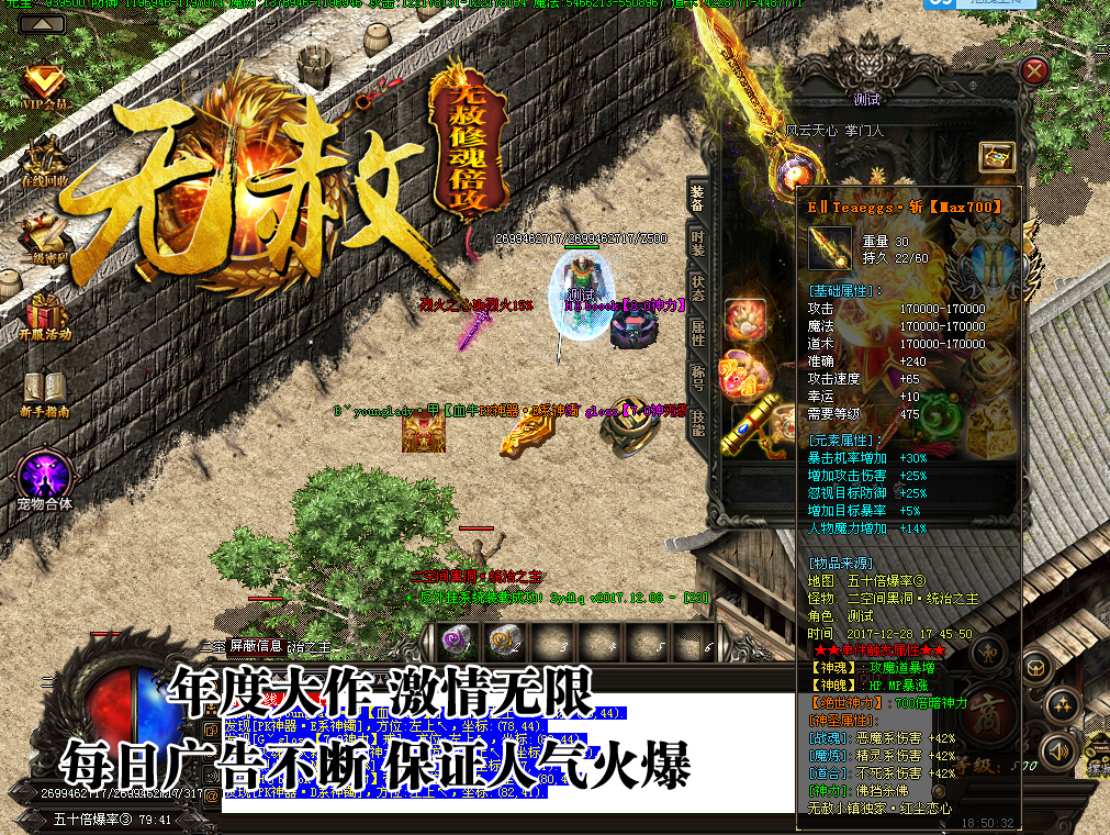 【游戏介绍】:本服是微端更新,不用特意下载补丁,只要一个干净的传奇客户端,把登录器下载了放进去,就可以游戏了!! 【游戏介绍】:本服元宝基本比例元宝1:500000,无赦币1:1000,网银100% 平民消费回馈15元,无隐藏消费,完全公平公正原则,所有人同一起点! 【游戏介绍】:无赦狂暴季语录:欢迎进入无赦狂暴季·单职业,游戏历时半年,完美设置,好玩耐玩,开创单职业全新篇章!! 【游戏介绍】:散人攻略:新人上线双开两号,主号泡点,小号直接到新手地图召唤BB直接咬BOSS或福利怪爆率很可观! 【游戏介绍】:小资攻略:首先将宠物升级满阶,提升秒怪法宝提升,就可轻松挑战所有BOSS,看脸时代,你说了算! 【游戏介绍】:土豪攻略:上线领取充值后直接领取满回馈打装备PK!(称号越高爆率越高)!! 【游戏介绍】:重要提示:所有材料装备游戏一概不出售全靠怪物爆出.这样一来非常保值!绝对是紧俏的商品! 【游戏介绍】:挑战篇章:世界BOOS地图,必爆高级物品地图,土药也刷新一只哦,超级给力! 【游戏介绍】:活动攻略:游戏只设置新区才有活动,各类活动请查看游戏活动列表(活动奖励非常丰富)不要错过! 【游戏介绍】:地图分类:新手地图,等级地图,转生地图,土豪地图,沙巴克地图!超多地图等你去挑战! 【游戏介绍】:怪物分类:本游戏BOSS种类繁多,只要是BOSS都不要放过,血量越高爆率越高,运气好直接鸟枪换大炮! 【游戏介绍】:特别提示:完美封杀所有·打造绿色游戏环境!重金推广·万元广告·人气火爆·等你来战 【游戏介绍】:无赦狂暴季宣言:★10元满回馈★无比例★★无托★装备保值★散人天堂★无限激情★巅峰巨作★全新起航★