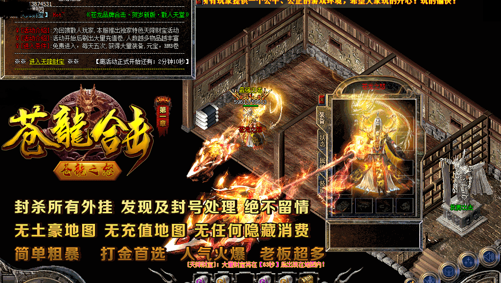 新区开启,独家苍龍合击第一章装备靠打,物价保值,地图丰富,长期耐玩!