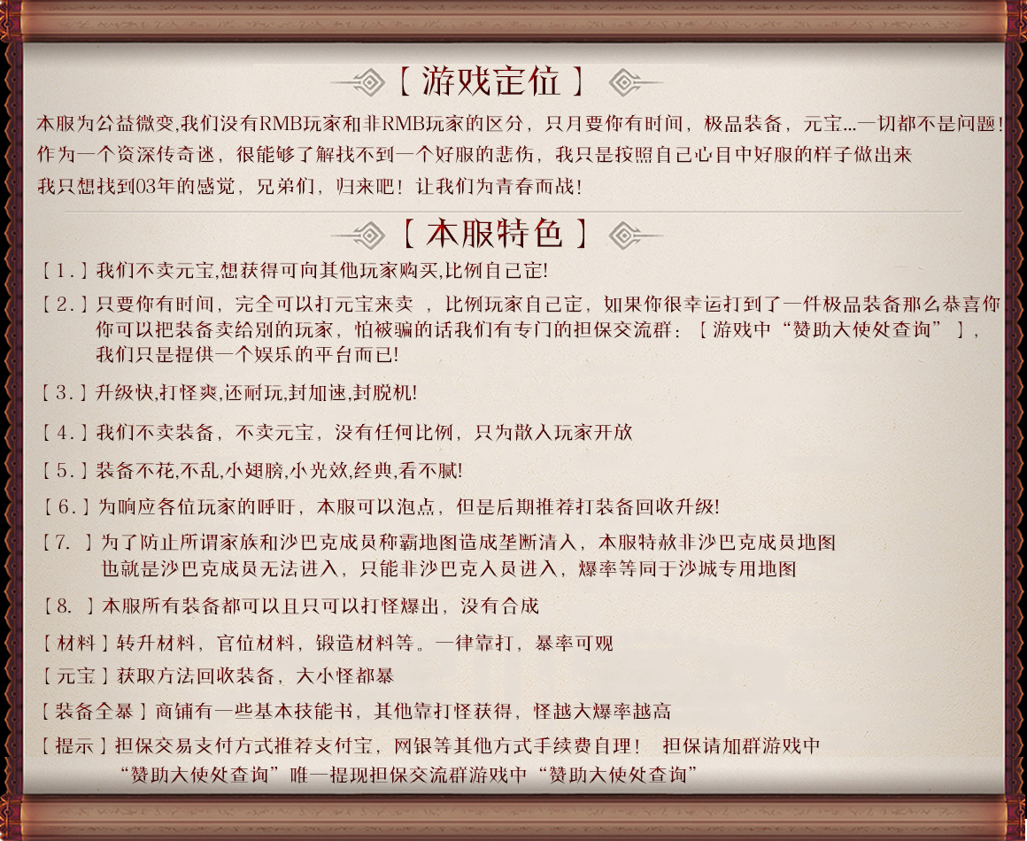 3、本服设有RMB终极回收,起源成品武器衣服=1000元RMB每件,7转时装=1000RMB每件