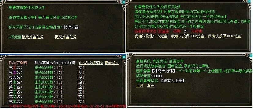 时空隧道:每日可进入1次-转生低于12转的可贿赂再次进入-里面共10层-越到后面BOSS越牛-爆率越高-爆一切装备!